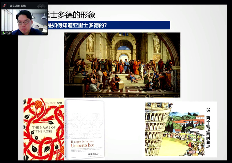 讲座中,王晨老师从哲学与哲学史关系的思考出发,以文本为线索呈现亚里士多德宏大的哲学体系概貌,阐述亚氏思辨哲学与实践哲学核心原则的独创性,并对亚里士多德哲学的当代境遇加以述评。他认为从雅典时代的帝师到中古时期被奉为哲学的化身,亚里士多德无疑是史上最负盛名的哲学家之一。虽然大哲学家的学说曾一度为历史尘埃所掩埋,但这丝毫不影响其百科全书式的思想体系对人类文明的卓越贡献。