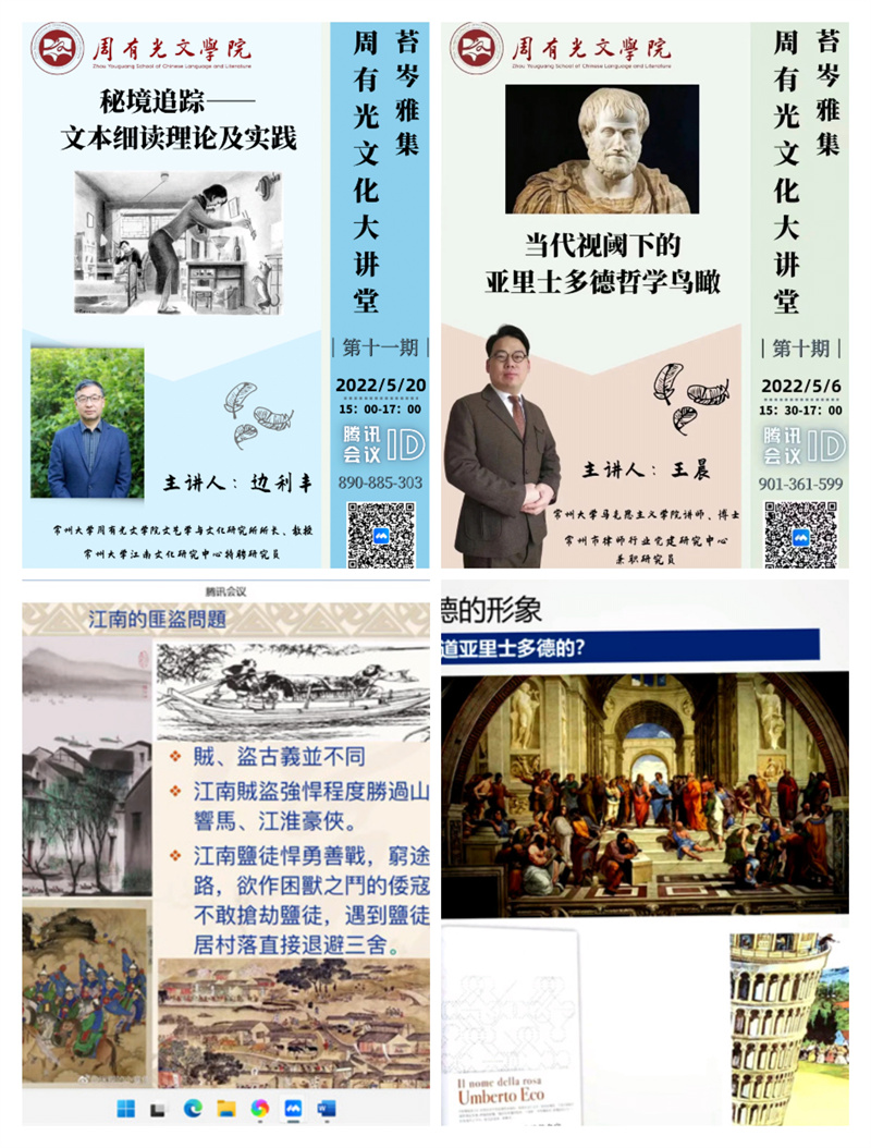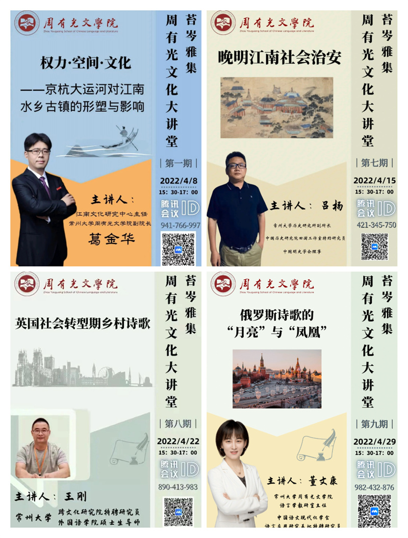 周有光文化大讲堂活动在周有光基金的支持下,邀请院内外专家开设专题讲座,内容涵盖文学与社会、文学与历史、文学与地方文化、文学与哲学、文学与传播,如《权力﹒空间﹒文化—京杭大运河对江南水乡古镇的形塑与影响》、《俄罗斯诗歌的“月亮”与“凤凰”》、《消失的艺术:后工业时代的“短视频”生产》、《韩国电影的现实表达与文化想象》、《秘境追踪——文本细读理论及实践》、《当代视阈下的亚里士多德哲学鸟瞰》、《英国社会转型时期乡村诗歌》、《晚明江南社会治安》等,通过文本研读、作品赏析、思想阐释、传播分析、专题研究等不同角度,展现文学与不同学科的融合,让大家在充分领略语言文学之美的同时,潜移默化接受专业知识熏陶,形成文学与其他学科融合的自觉,涵养学术兴趣与品位,为开拓未知世界打下基础。