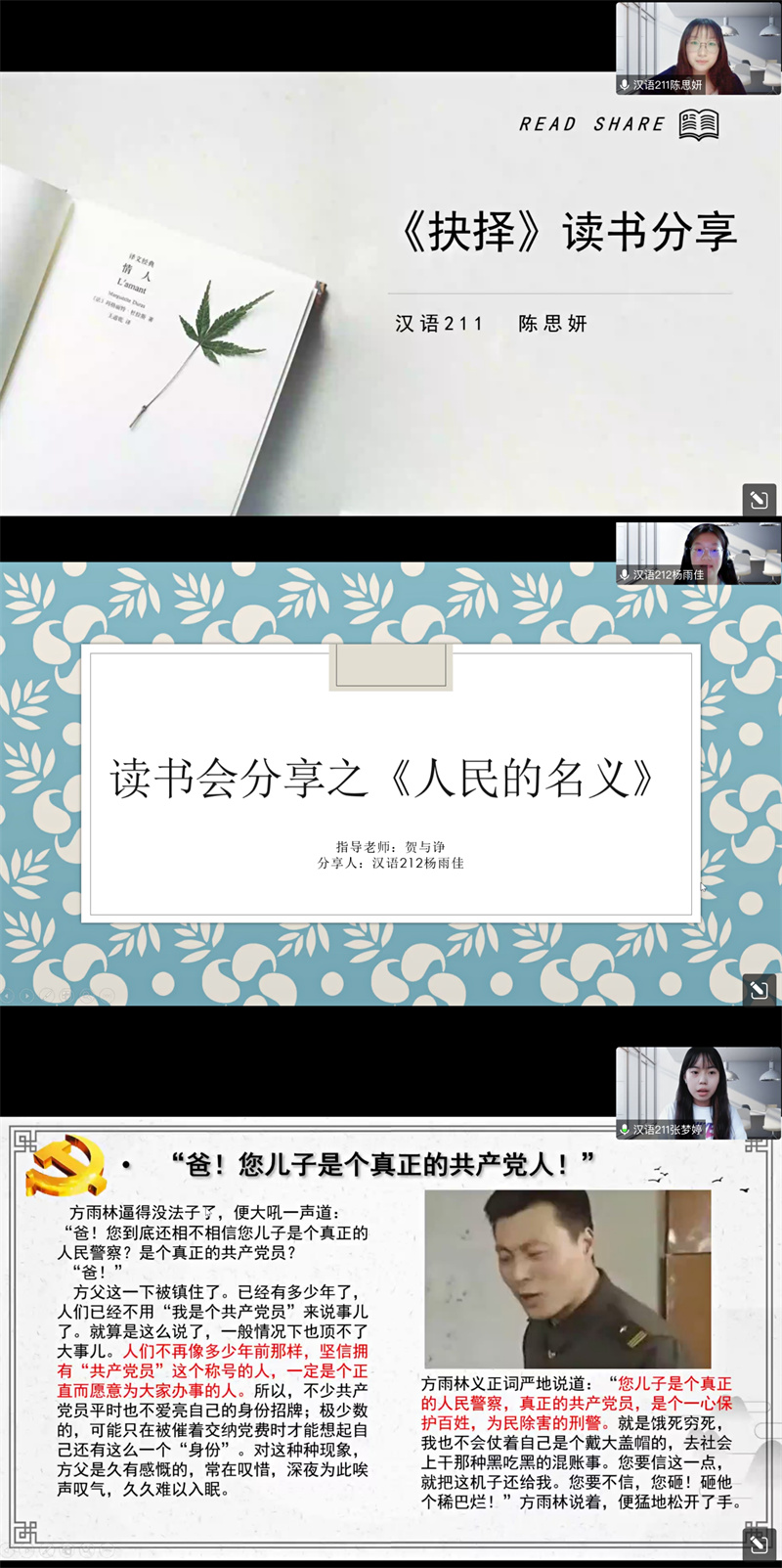 首先,三位同学从不同的角度分享了自己的读书心得。张梦婷同学从国企改革、职工下岗、反腐倡廉、官场角逐四个方面分享了《大雪无痕》中体现的反腐败与反黑恶势力的坚定信念;陈思妍同学从《抉择》主要人物李高成的人物塑造、场景描写、人民性写作等方面加深了大家对廉洁公正、官民一心、党群一心的理解;杨雨佳同学分析了《人民的名义》中侯亮平、祁同伟的人物形象和书中极具穿透力的语言描写,再现了反腐斗士的坚定信仰和无畏勇气。