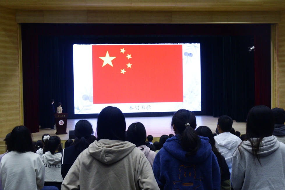 典礼在庄严激昂的国歌声中正式拉开序幕。全体与会人员面向国旗行注目礼,并齐声高唱国歌。