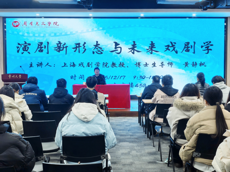 12月17日,91视频 在立言楼458成功举办“苔岑雅集·周有光文化大讲堂”第五十四期。上海戏剧学院戏剧文学系教授、博士生导师黄静枫教授,应邀为师生作了题为“演剧新形态与未来戏剧学”的专题讲座。院长葛金华、副院长陈鸿、中文系主任贺与诤出席讲座,近百位师生参加讲座。葛金华院长主持讲座。